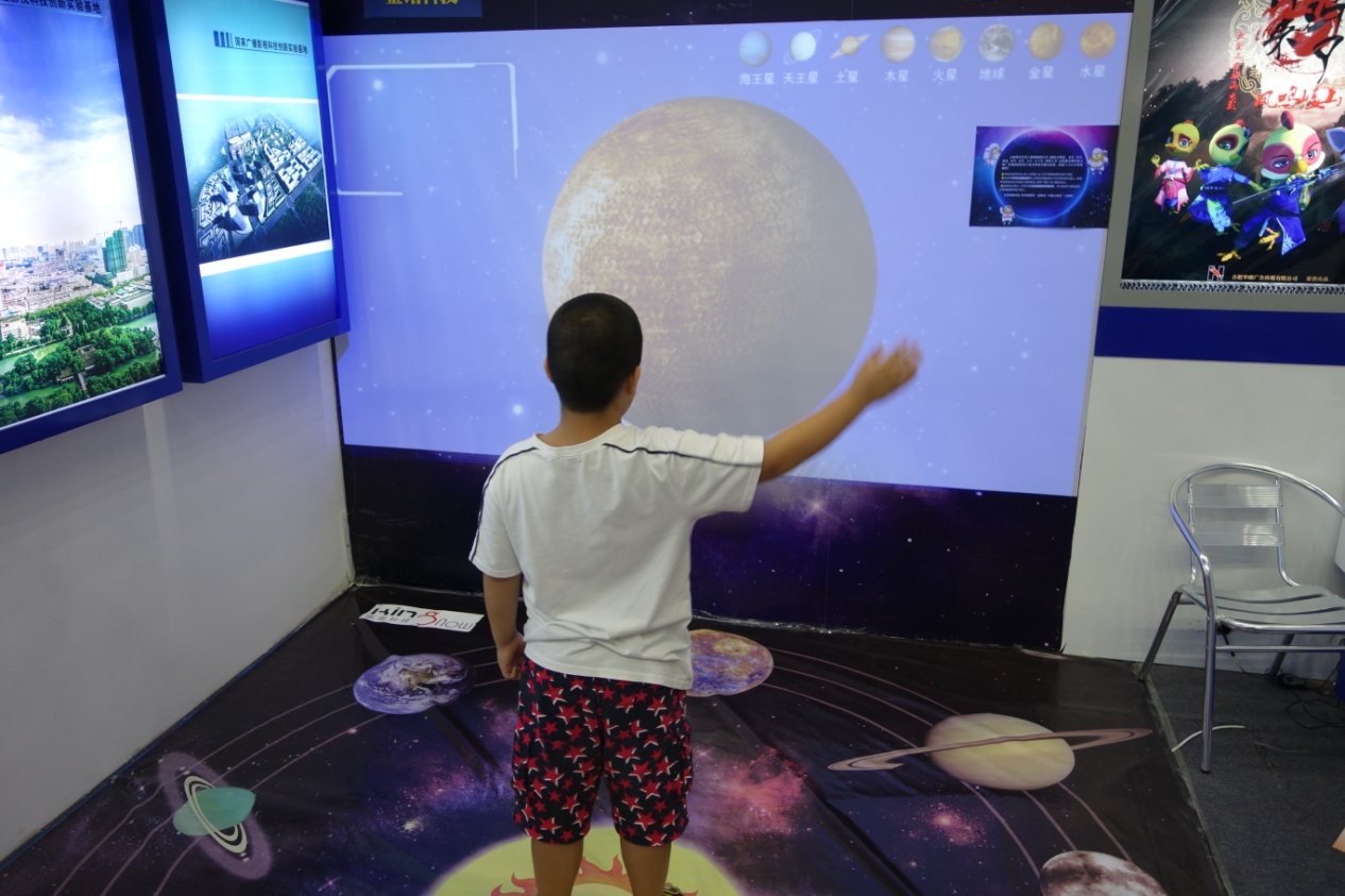 此次參展的“穿越太陽系”,即是以卡通角色“諾諾”在宇宙中冒險(xiǎn)的故事為背景,以太陽系八大行星相關(guān)科普知識(shí)為內(nèi)容,以體感為操控方式,采用虛擬現(xiàn)實(shí)、體感互動(dòng)等多種先進(jìn)技術(shù)手段讓觀眾獲得沉浸式環(huán)境體驗(yàn),提高廣大青少年兒童對(duì)天文知識(shí)的了解和興趣。新奇有趣的體驗(yàn)方式吸引了現(xiàn)場(chǎng)觀眾,特別是青少年兒童的熱情參與,成為本屆深圳文博會(huì)上的一大亮點(diǎn)。
